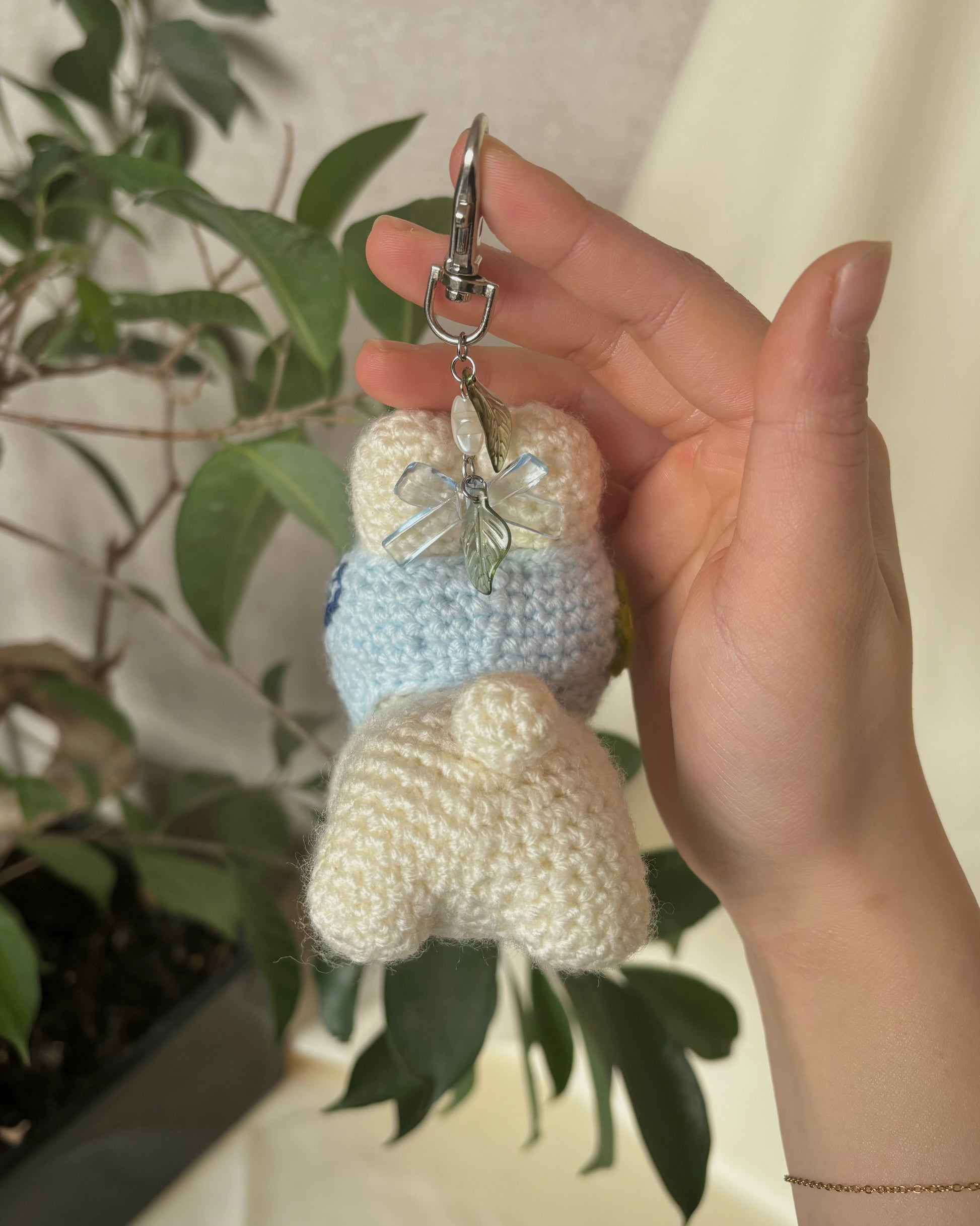 - Blueberry cake roll themed bunny keychain, made with 4mm acrylic yarn!
