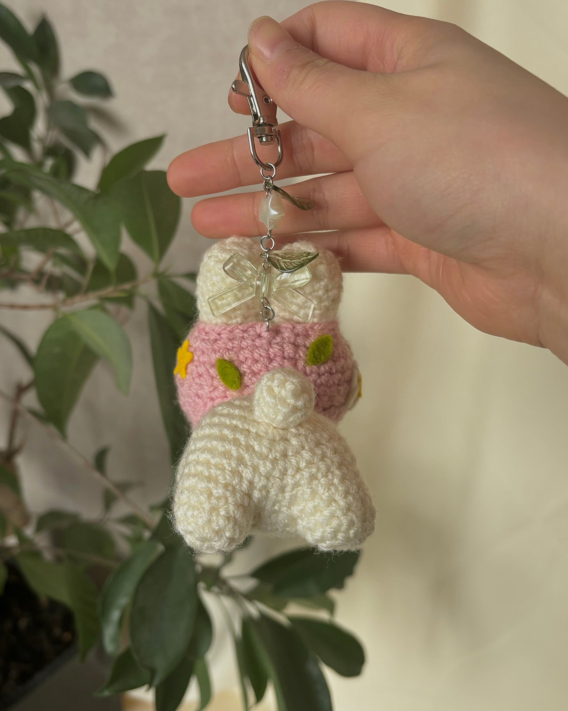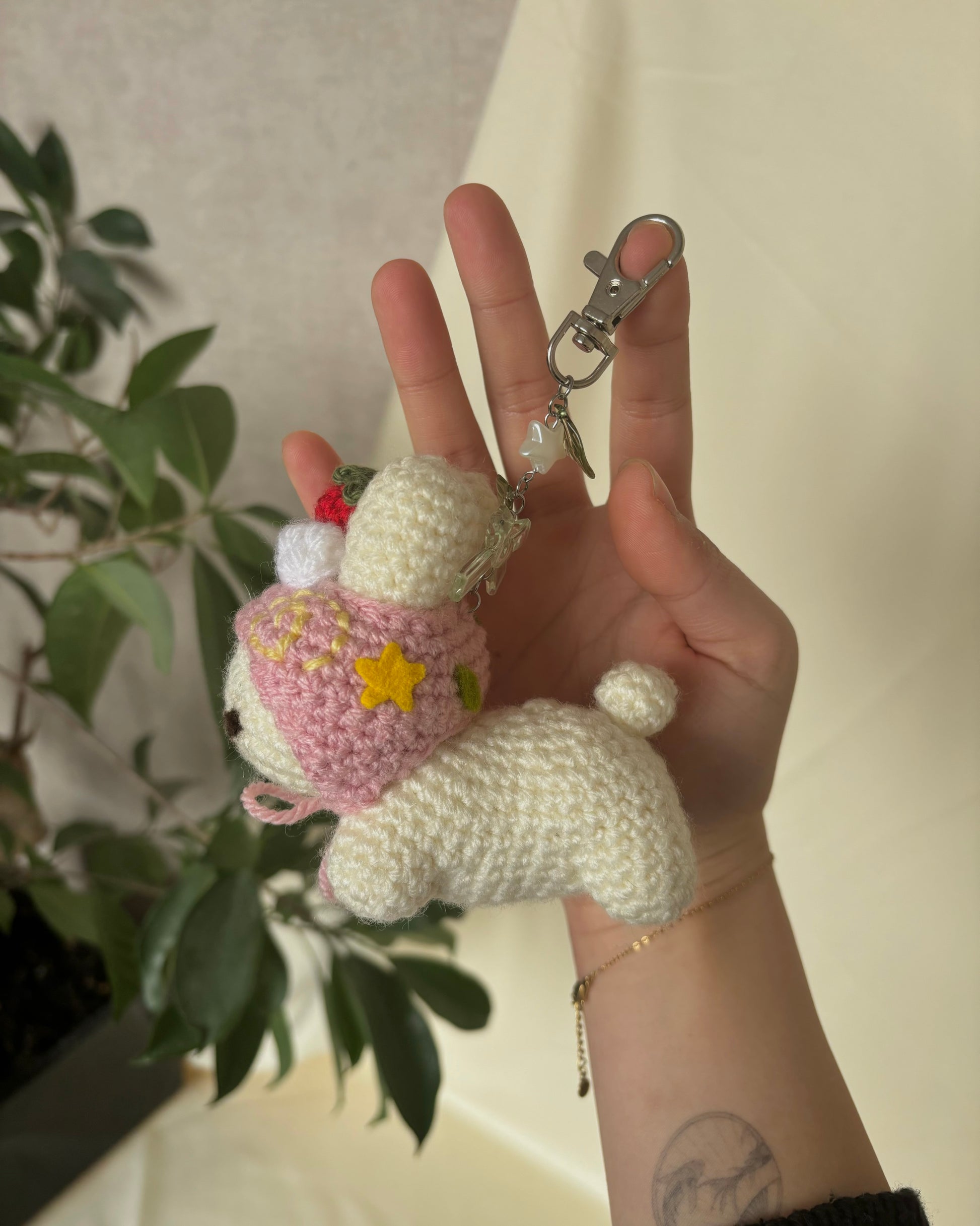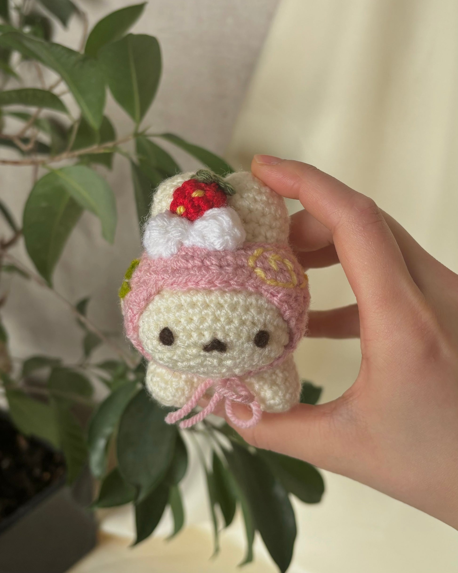 - Strawberry cream cake roll themed bunny keychain, made with 4mm acrylic yarn!